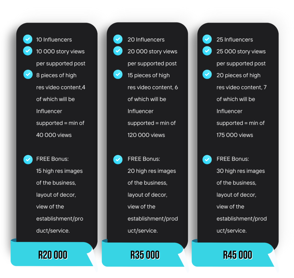 This package is suited for one day events that your company may be hosting. This package will also use influencers to promote the event & your brand.